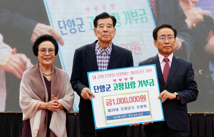 [뉴스다컴] 충북 단양군은 지난 19일 단양 공설운동장에서 열린 신단양 이주 40주년 기념식에서 제20대 단양군수를 역임한 오병하 전 군수가 고향사랑기부금 100만 원을 기탁했다고 밝혔다.
