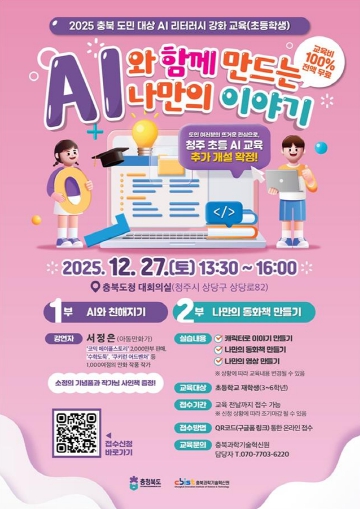 [뉴스다컴] 충청북도는 오는 12월 27일 13:30 충북도청 대회의실에서 도내 초등학생(3~6학년)과 학부모 200여명을 대상으로 ‘AI 웹툰 교육(중부권 2차)’을 진행한다고 밝혔다. 이번 교육은 북부권(충주), 남부권(옥천), 중부권 1차(청주)에 이어 2025년 마지막으로 개최되는 도내 AI 창작 체험 프로그램이다.
