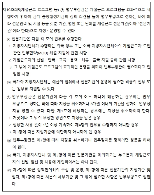 아울러 지방정부의 행정부담을 줄이고 도입 과정에서의 투명성을 높이기 위해 전문인력과 시설을 갖춘 기관, 법인 또는 단체를 '계절근로 전문기관'으로 지정·운영할 수 있는 근거도 마련됐다.