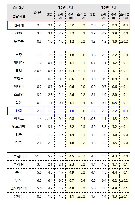 향후 세계경제 성장률은 ’25년 3.2%(’25.6월 전망 대비 +0.3%p), ’26년 2.9%(’25.6월 전망과 동일)를 기록할 것으로 전망했으며, 올해 하반기에는 조기선적 효과가 감소하고 관세 인상과 높은 정책 불확실성이 투자와 무역을 위축시키면서 성장세가 둔화될 것으로 예상했다.