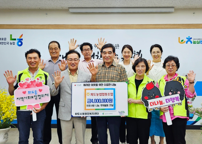 한편, 화도농협은 동부희망케어센터와 지역사회보장협의체 등 관내 다양한 사회단체 지원을 비롯해 학생 장학금 기부, 이재민 구호 물품 후원 등 매년 약 1억 5천만원 규모의 기부를 통해 지속적인 사회공헌 활동으로 상생 가치를 실현하며 더불어 사는 문화 정착에 앞장서고 있다.