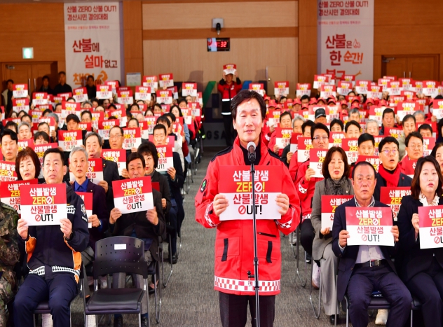 이번 결의대회에는 조현일 경산시장, 이동욱 경산시 의회 부의장 외 도⸱시의원 및 26개 지역기관⸱관변단체장 등 200여 명이 참석한 가운데 △산불 예방 책임 선언문 낭독 △산불 예방 공동 실천 결의문 서명식 △피켓 퍼포먼스 △산불 OUT 퍼포먼스 순으로 진행됐다.