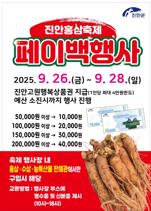 이번 페이백 행사는 축제장을 찾은 방문객이 진안홍삼·수삼·농특산물을 구매할 경우, 결제 금액의 일부를 ‘진안고원행복상품권’으로 돌려주는 소비자 환원형 이벤트다.