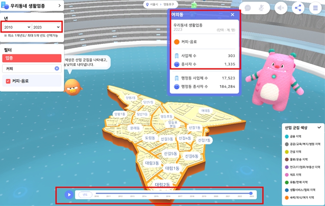 이번 서비스의 핵심 기능 중 하나는 2010~2023년 사업체 조사 데이터를 활용해 서울 전역 산업구조 변화와 흐름을 입체적으로 볼 수 있도록 ‘행정동 단위 산업․상권 변화’를 3차원 시각화한 기능이다. 특정 자치구나 행정동을 선택해 2010년 이후 어떤 산업이 성장하거나 쇠퇴했는지를 시간 흐름에 따라 확인할 수 있다.