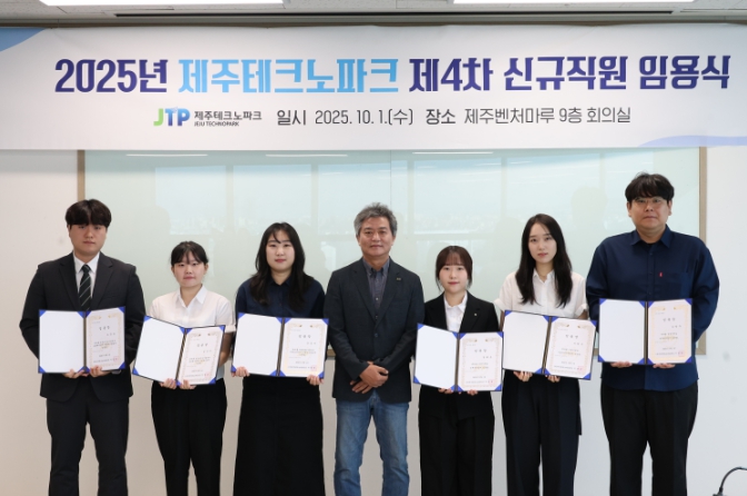 [뉴스다컴] 제주테크노파크(원장 지영흔, 제주TP)가 1일 제주벤처마루 9층 회의실에서 6명의 신규직원에게 임명장을 수여했다.