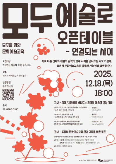 [뉴스다컴] 서울 성북구는 오는 18일 오후 6시, 성북문화예술교육센터 5층에서 장애·비장애 통합 문화예술교육의 방향과 가능성을 모색하는 '모두를 위한 문화예술교육 '모두 예술로' 오픈 테이블 – 연결되는 사이'를 개최한다.