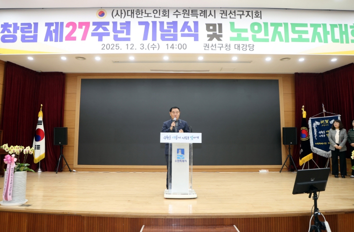 [뉴스다컴] 수원특례시의회는 3일 권선구청 대회의실에서 열린‘대한노인회 수원시 권선지구 제27주년 기념식 및 노인지도자대회’에 참석해 어르신 지도자들의 노고를 축하하고 격려했다.