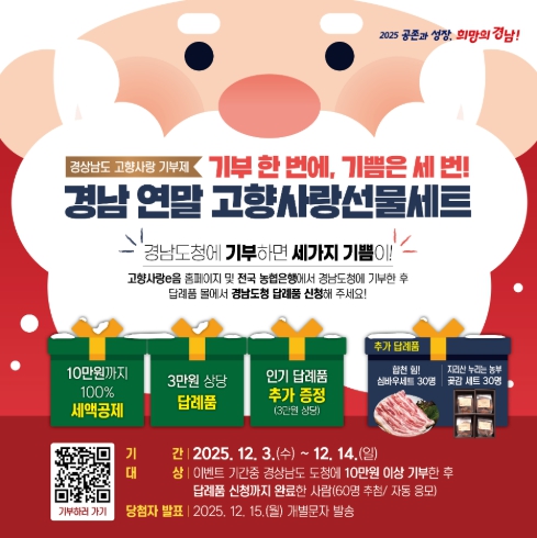 이번 행사는 ‘기부 한 번에, 기쁨은 세 번! 경남 연말 고향사랑선물세트’라는 주제로 기획됐다. 경남도에 10만 원 이상을 기부하면 ①세액공제(10만 원까지 전액 환급, 초과 시 16.5%), ②답례품(기부금의 30% 내) 혜택에 더해 ③추첨을 통한 인기 특산품 추가 증정 기회까지 제공해 기부자에게 파격적인 혜택을 선사한다.