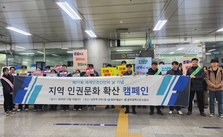 [뉴스다컴] 광주도시공사(사장 김승남)는 지난 10일 서구 상무역에서 광주교통공사와 합동으로 인권문화 존중 캠페인을 펼쳤다고 밝혔다.