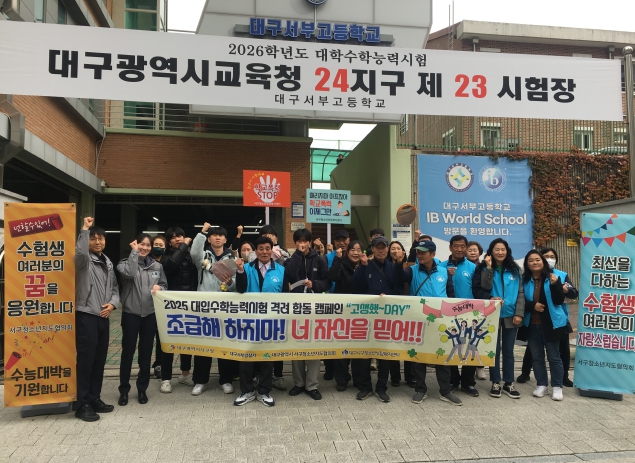 [뉴스다컴] 대구 서구 청소년지도협의회(회장 황만태)는 지난 12일, 서부고등학교 정문에서 학생들의 수능 예비 소집일 시간에 맞춰 수험생 응원 및 선도·보호 합동 캠페인을 실시했다.