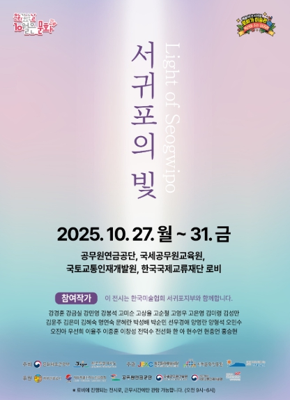 ‘예술이다 서귀포, 혁신이 주는 달콤함’의 피날레를 함께하는 한국미술협회 서귀포지부와 함께하는 특별기획전시 '로비가 미술관: 서귀포의 빛'이 27일(월)부터 31일(금)까지 추진된다. 전시는 공무원연금공단, 국세공무원교육원, 국토교통인재개발원, 한국국제교류재단 로비에서 동시에 펼쳐지며, ‘서귀포의 빛’이라는 주제로 아름답게 빛나는 서귀포의 모습과 색감을 작가들의 다양한 감성으로 표현된 작품을 선보인다. 매일 스쳐지나가는 로비의 풍경에서 영감이 가득한 일터로의 변화를 느낄 수 있도록 기획했다.