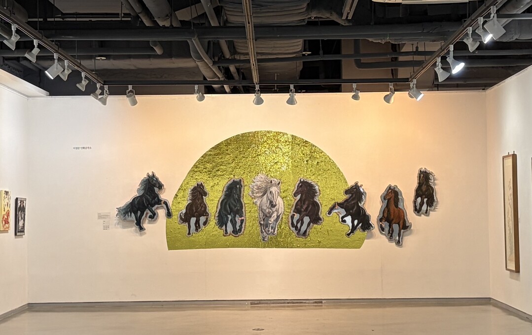〈태양을 품은 길상〉은 여덟 명의 작가가 함께 참여해 완성한 작품으로, 팔준마(八駿馬)를 주요 모티브로 삼고 있다. 팔준마는 고대부터 장수의 덕목이자 승리와 출량, 길상과 발전을 상징해온 존재다. 작품 속 여덟 마리의 말은 각기 다른 색감과 질감, 필치로 표현되었지만, 화면 전체에서는 하나의 흐름을 이루며 힘차게 앞으로 달려 나아간다.