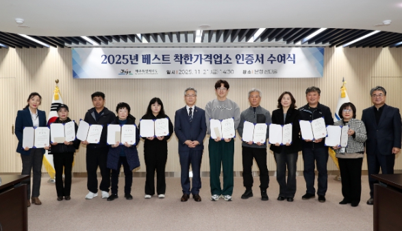 [뉴스다컴] 제주특별자치도는 도내 최초로 ‘2025년 베스트 착한가격업소’ 15개소를 선정하고 21일 인증서 수여식을 개최했다.