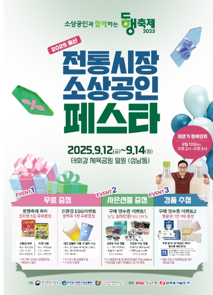 [뉴스다컴] 중소벤처기업부는 9월 동행축제를 맞아 울산 성남동 태화강 체육공원에서 9월 12일부터 14일까지 대규모 지역 행사 ‘울산 전통시장‧소상공인 페스타’를 개최한다고 밝혔다.