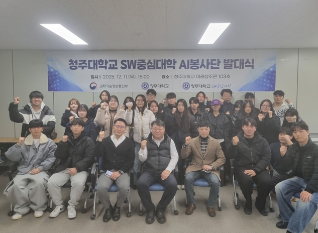 [뉴스다컴] 충청북도는 12월 11일 청주대학교 미래창조관에서 청주대학교 AI봉사단(1기, 30명)을 출범하고, 도내 AI 역량 강화를 위한 지역 밀착형 교육을 본격 추진한다고 밝혔다.