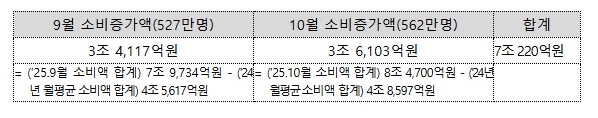 한편, 9·10월 환급(페이백) 지급 대상자(중복 포함, 1,089만명)가 작년 월평균 카드 소비액보다 총 7조 220억원을 더 지출한 것으로 확인됐다. 이는 지급액(6,430억원)의 11배에 달하는 규모다.