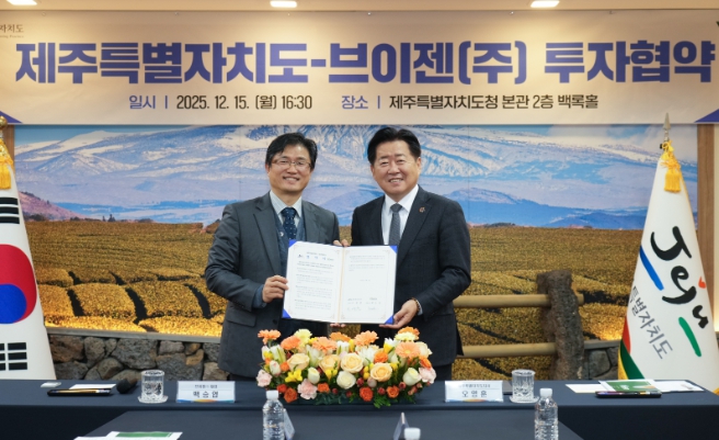 제주도는 15일 오후 4시 30분 도청 백록홀에서 브이젠㈜과 신설 투자 및 신규 채용 등을 주요 내용으로 하는 투자협약을 체결했다.