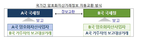 국세청은 정보교환협정 가입국과 상대국 거주자의 암호화자산 거래정보를 상호교환 하며, 첫 정보교환은 ’26년 거래정보에 대해 ’27년 이행 예정이다.