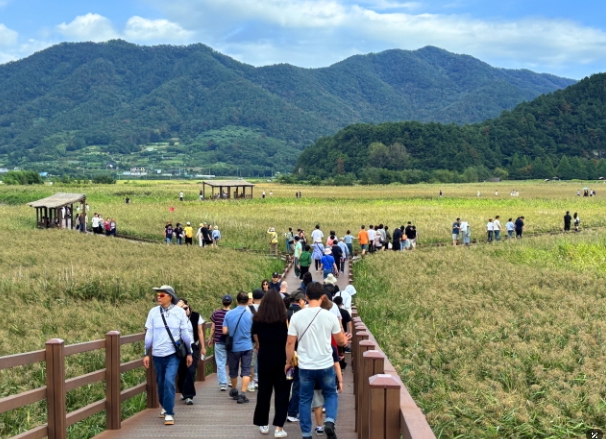 | ▲ 추석 연휴 순천만습지를 찾은 방문객들이 가을 정취 속에서 갈대밭 산책을 즐기고 있다 |